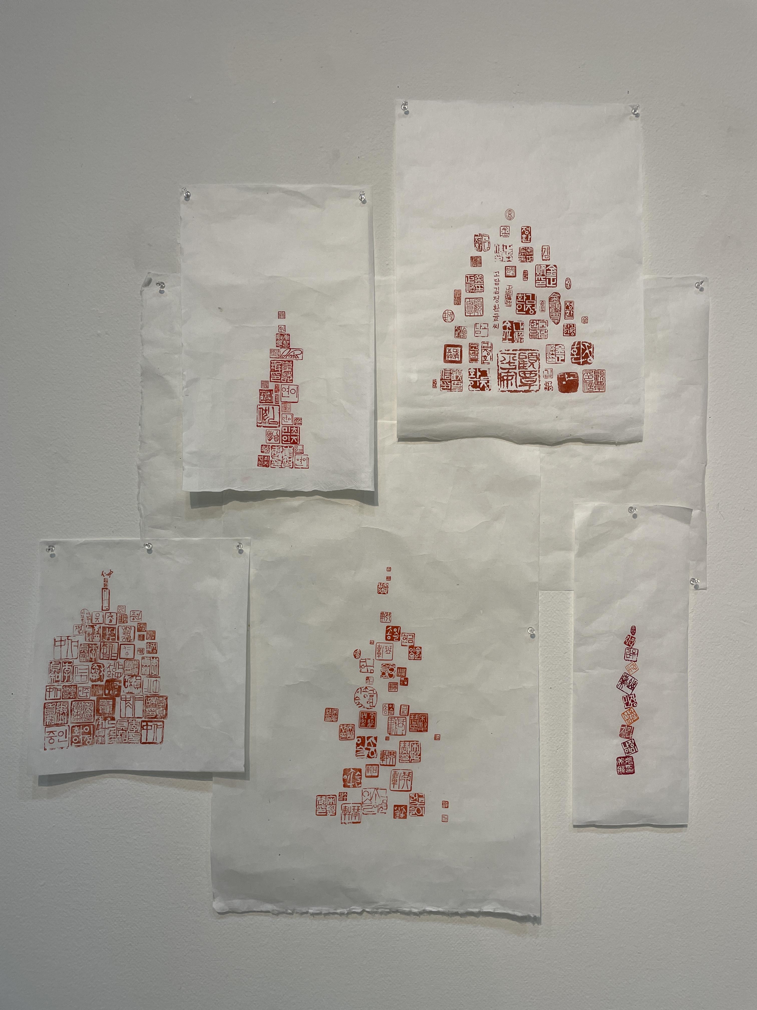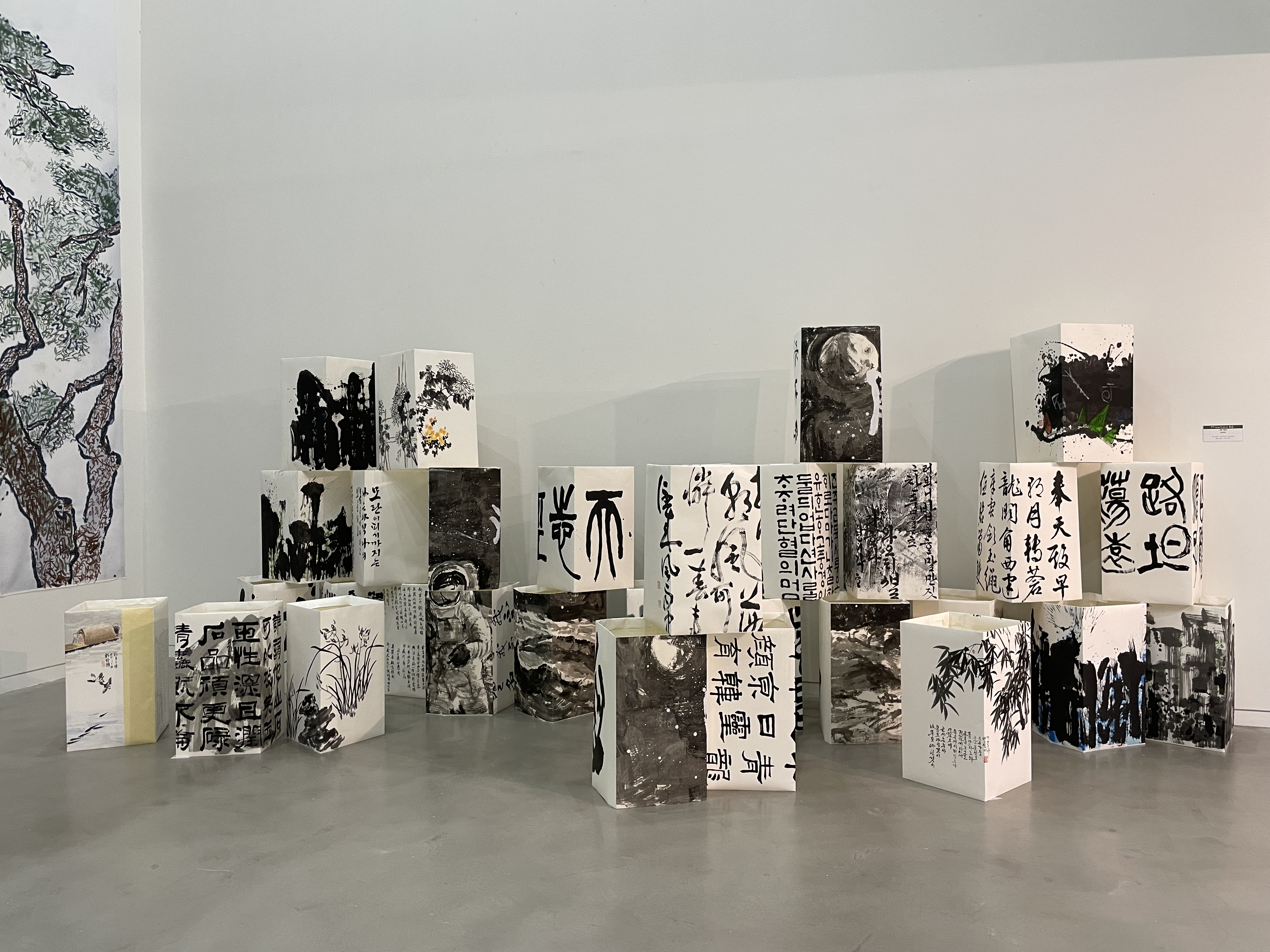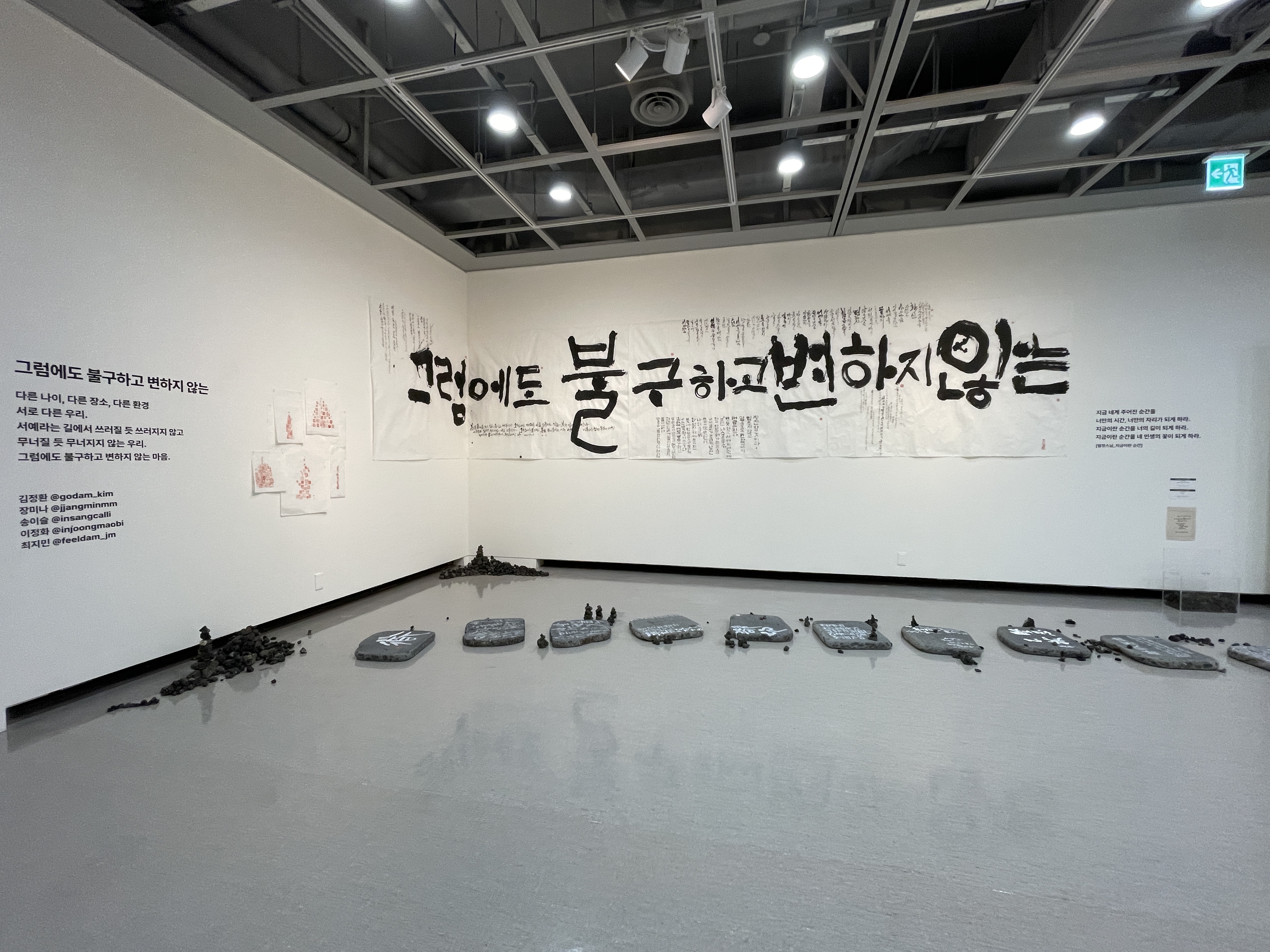 돌이라는 주제를 살리면서 서예와 접목한 설치 작품이네요.
