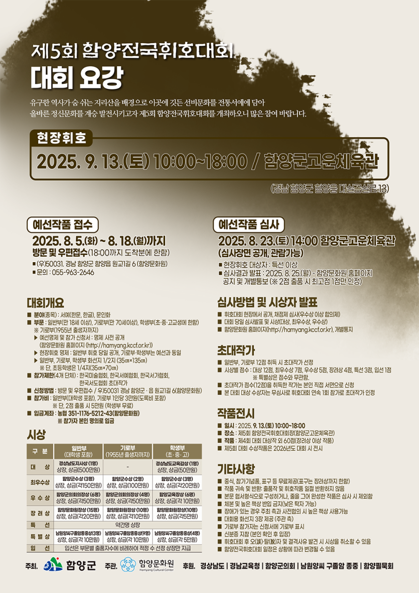 - 심사 발표: 2025. 8. 25.(월) 함양문화원 홈페이지 공지 및 개별통보