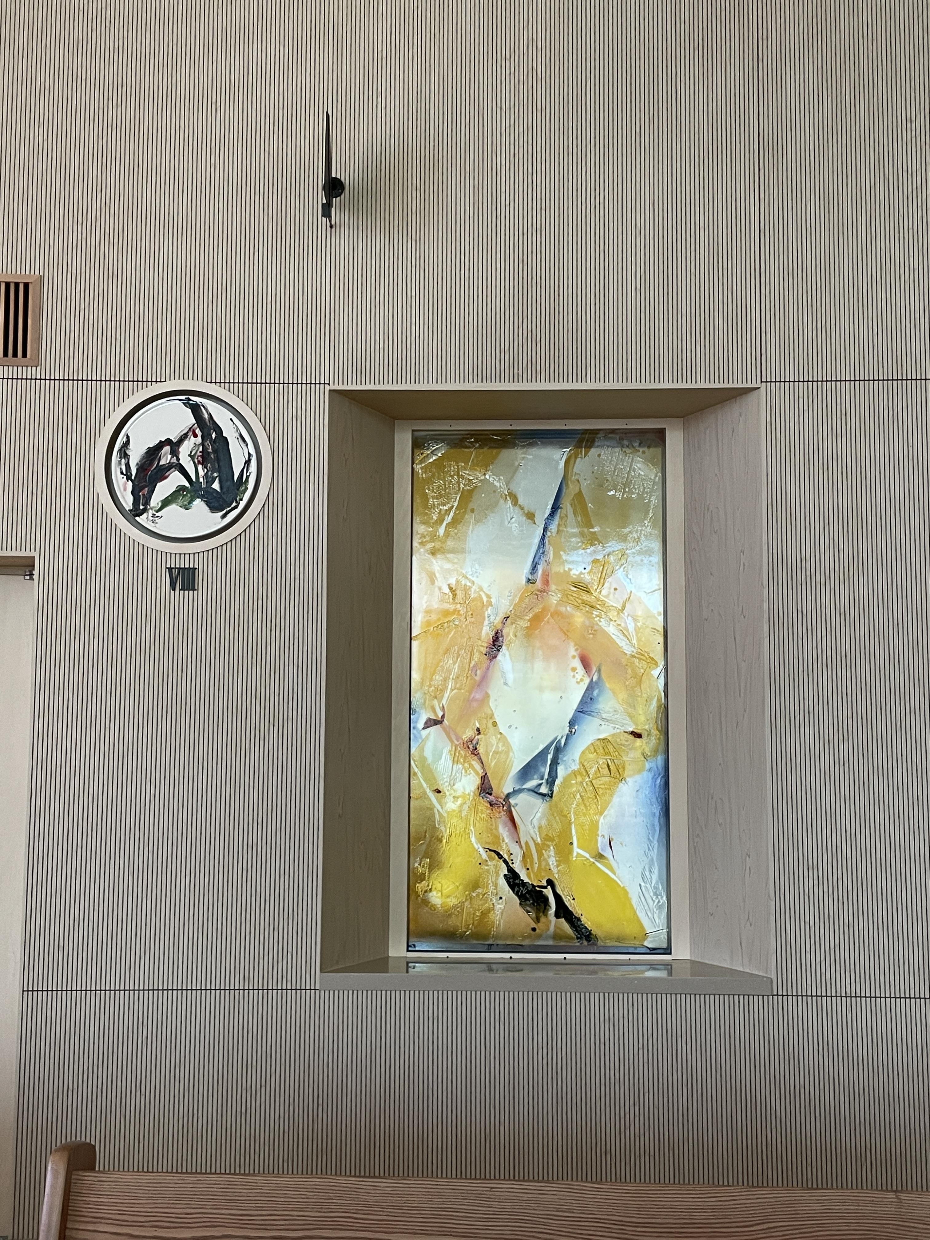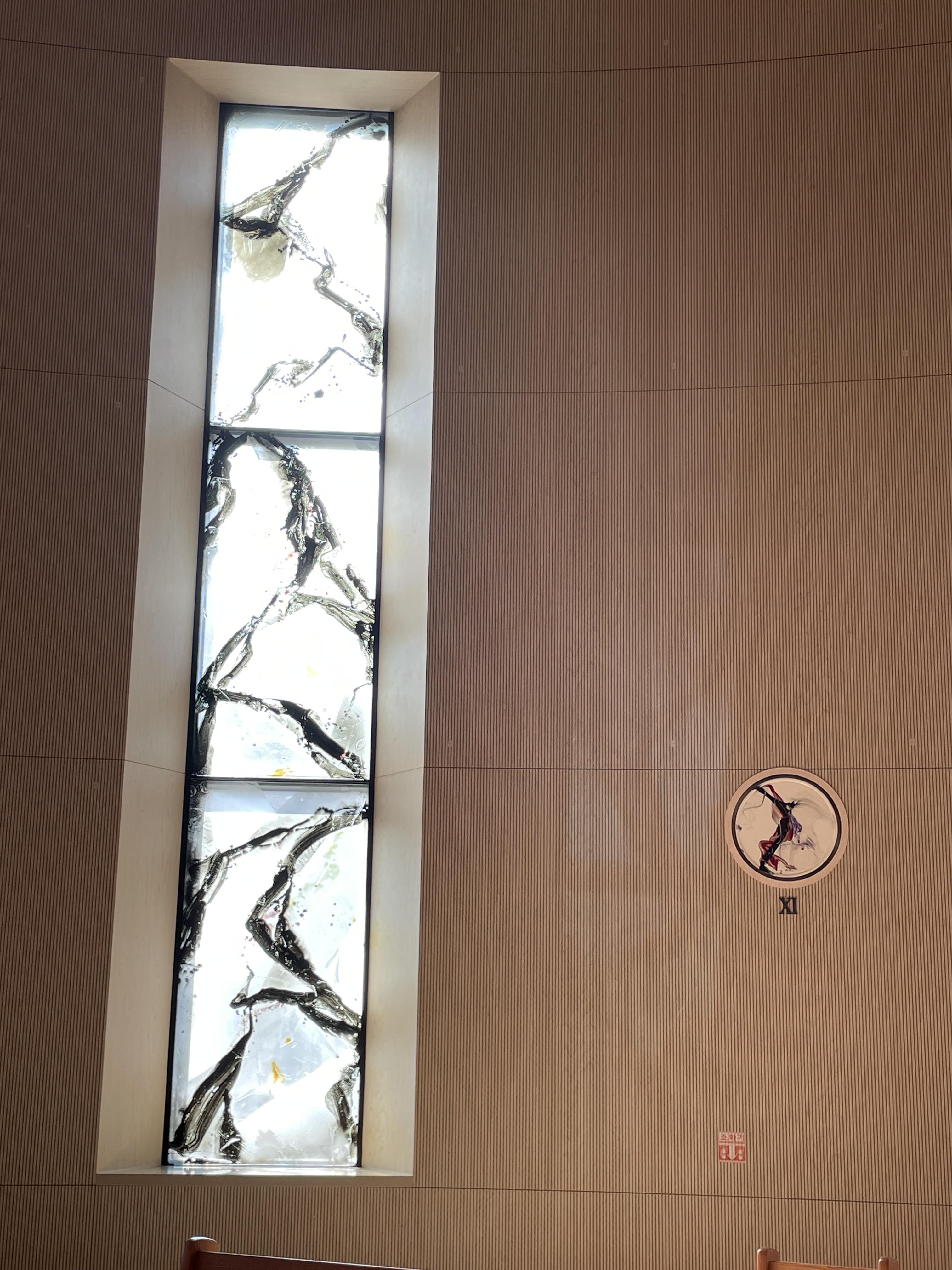 제대 색유리화를 비롯한 성전 좌ㆍ우측 각각 6개의 색유리화와 도자 회화 14처 등은 유럽에서 ‘빛의 화가’로 찬사를 받는 재불 화가 김인중(도미니코수도회) 신부의 작품이다. 성전 좌우 12점의 색유리화는 열두 사도, 사도로부터 이어오는 교회, 그 모두가 하느님을 향해 나아가는 것을 표현한다. 동양의 수묵화를 연상시키는 도자 회화 14처 등은 각자 마음을 비우고 믿음의 눈으로 그 의미를 받아들일 수 있도록 보는 이들을 이끈다.