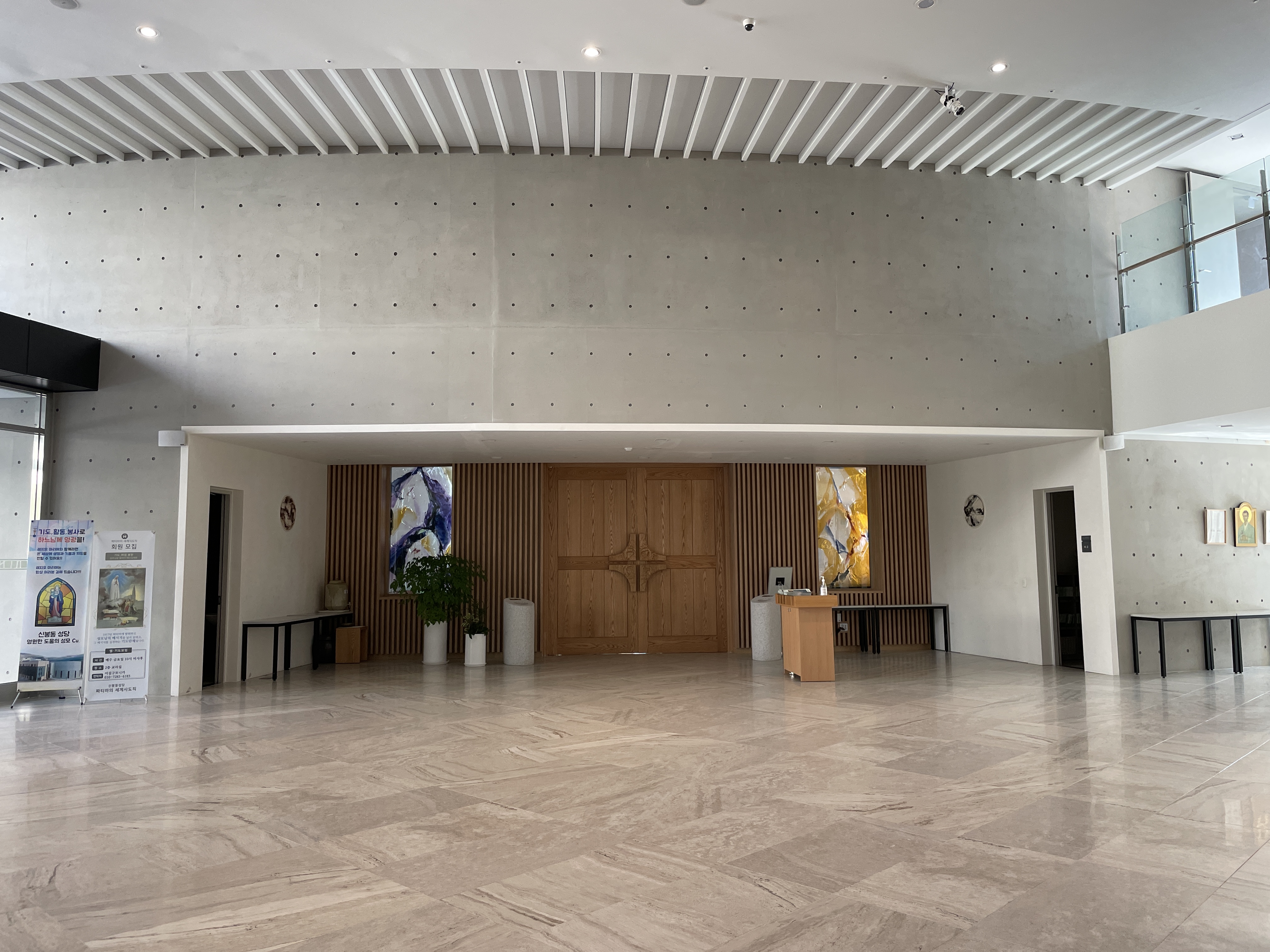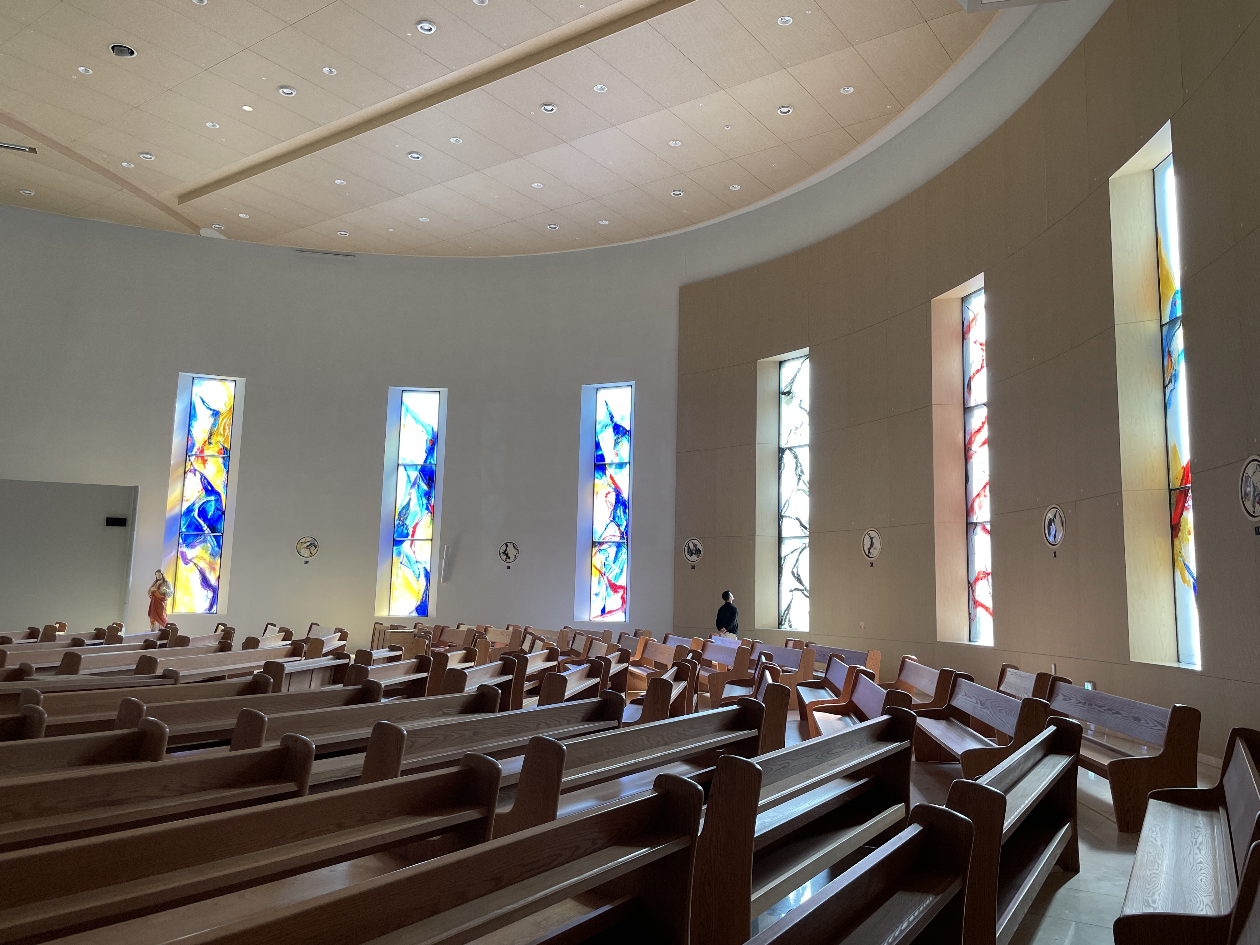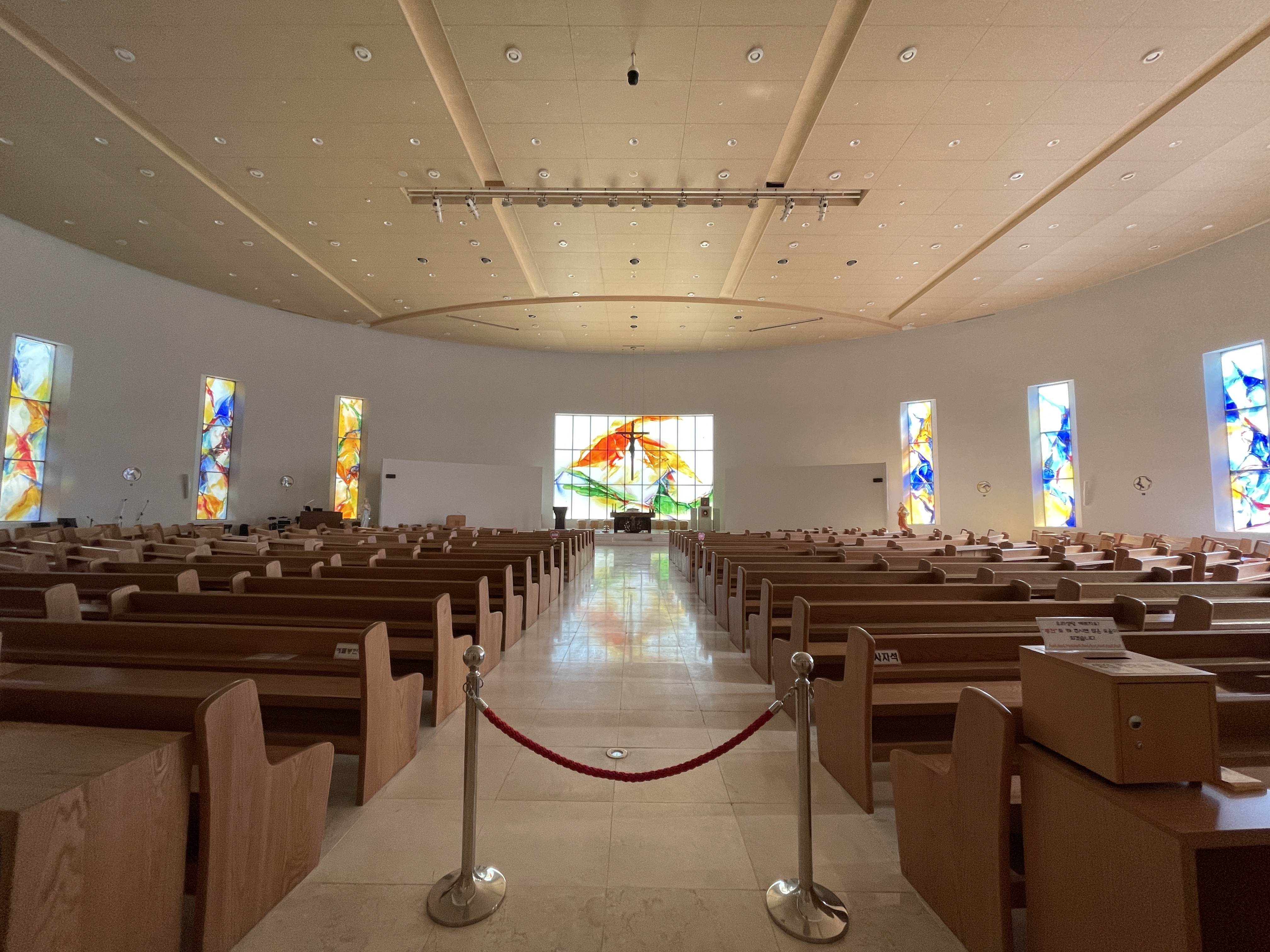 기둥 하나 없는 성전 내부는 탁 트인 개방감에 청량감마저 든다. 흰색 배경에 베이지색 나무 재질로 마감돼 있어 정갈하지만 단순하지 않은 공간을 연출한다.