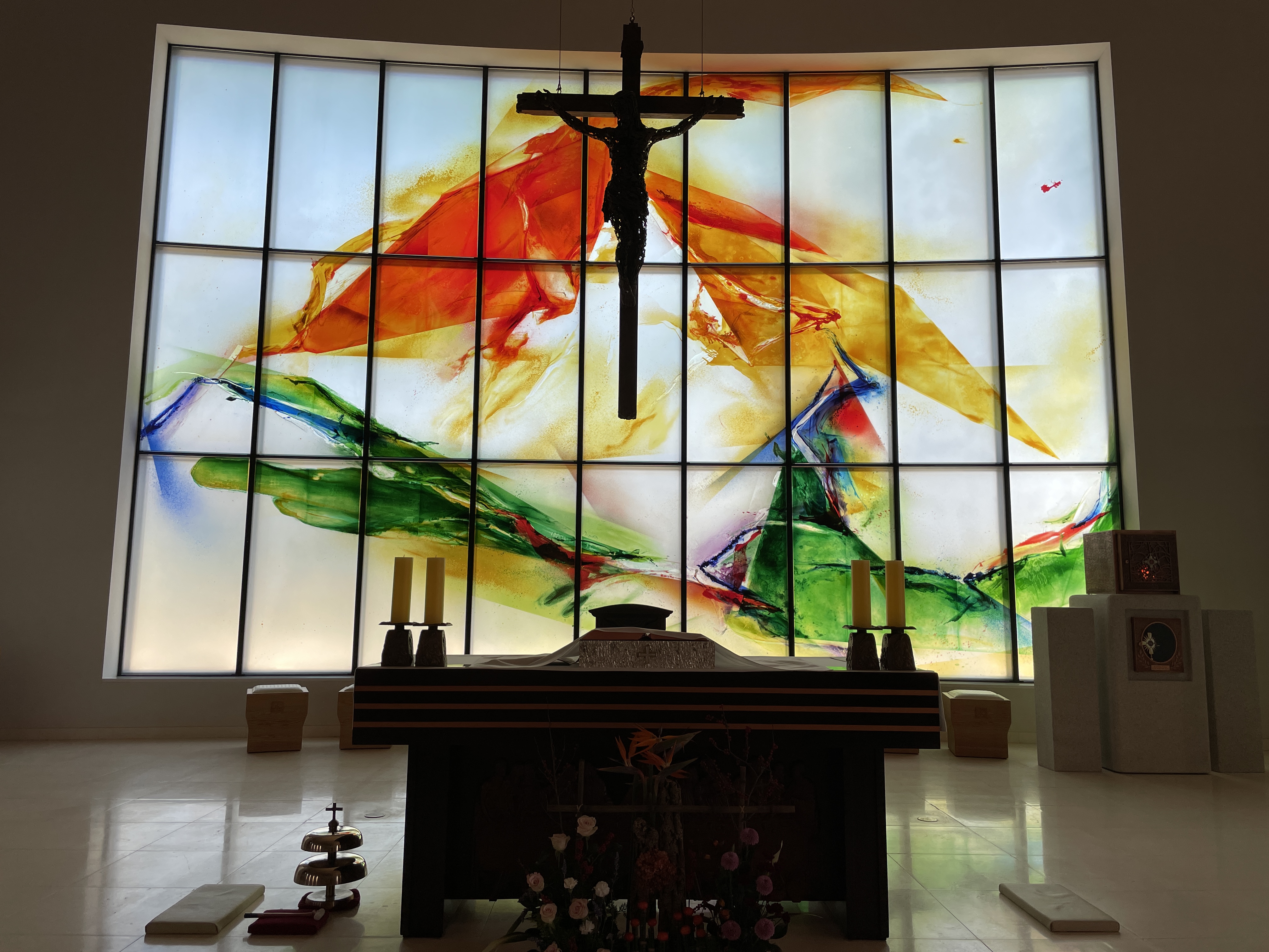 색유리화 앞에는 대형 십자가가 천장에서 길게 내려온 두 줄에 매달려 실루엣처럼 보인다. 나무를 부러뜨려 만든 듯한 십자가에 못 박힌 예수 그리스도는 지그시 눈을 감고 있다. 철을 얼기설기 엮어 만든 몸 곳곳에 구멍이 뚫려 빛을 투과한다. 인간의 죄로 인해 육신에 오상이 나고 그 상처를 통해 보이는 주님의 희생을 엿보는듯하다. 제대 우측에 자리한 감실 아래에는 오메트르 성인의 유해가 안치돼 있고 나무 제대에는 주님의 마지막 만찬 장면이 새겨져 있다.